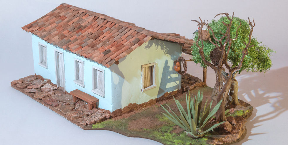Eis aqui uma novidade: uma casa caiada de azul, considerando que a predominância é o branco nas paredes e o azul nas janelas e portas. Esta representa uma construção recente, pelo aspecto do telhado, das janelas e portas, das paredes e do entorno. A quantidade de janelas na frente, também chama a atenção. A presença da árvore e do sisal representa o cuidado em plantar para embelezar e favorecer a sombra. Cabaça, corda de sisal enrolada, pote são elementos sempre presentes para o uso dos moradores. Vemos também uma cancela embaixo da árvore. Tudo muito harmonioso e atraente. Tudo tem beleza, tem história para contar.